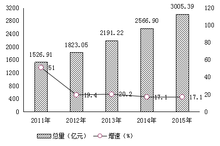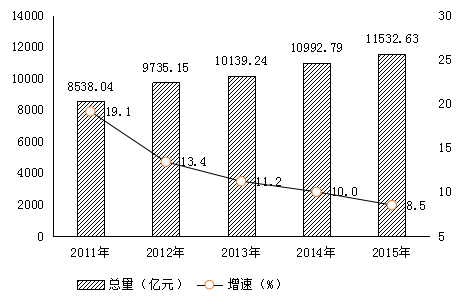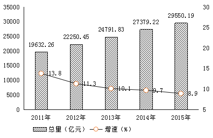 2015年,全省完成生产总值29550.19亿元,增长8.9%。其中:第一产业完成增加值3309.84亿元,增长4.5%;第二产业完成增加值13503.56亿元,增长8.3%;第三产业完成增加值12736.79亿元,增长10.7%。三次产业结构由2014年的11.6:46.9:41.5调整为11.2:45.7:43.1。在第三产业中交通运输仓储和邮政业、批发和零售业、住宿和餐饮业、金融业、房地产业、营利性服务业及非营利性服务业增加值分别增长4.4%、7.8%、7.1%、16.6%、6.5%、13.7%和12.6%。