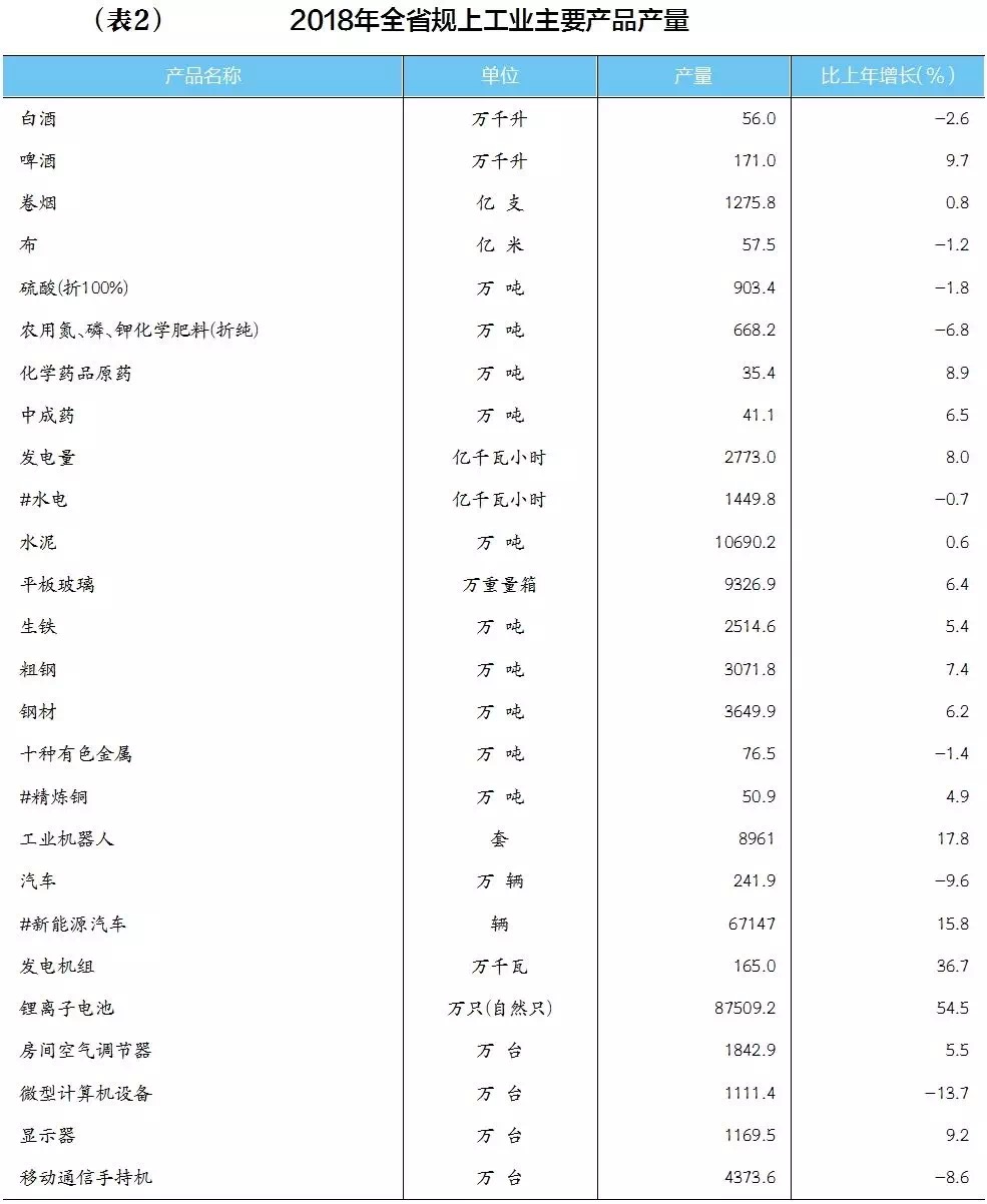 工业生产保持稳定增长。年末全省规模以上工业企业达到15598家。规模以上工业增加值增长7.1%。其中,国有及国有控股企业增长5.0%;集体企业增长1.6%;股份合作企业增长9.2%;股份制企业增长7.6%;外商及港澳台投资企业增长3.8%;其他经济类型企业增长7.1%。轻工业增长7.4%;重工业增长6.8%。