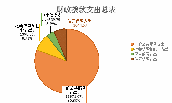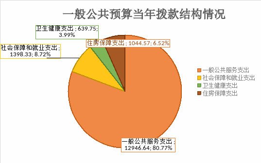 一般公共服务支出12946.64万元,占80.77%;社会保障和就业支出1398.33万元,占8.72%;卫生健康支出639.75万元,占3.99%;住房保障支出1044.57万元,占6.52%。